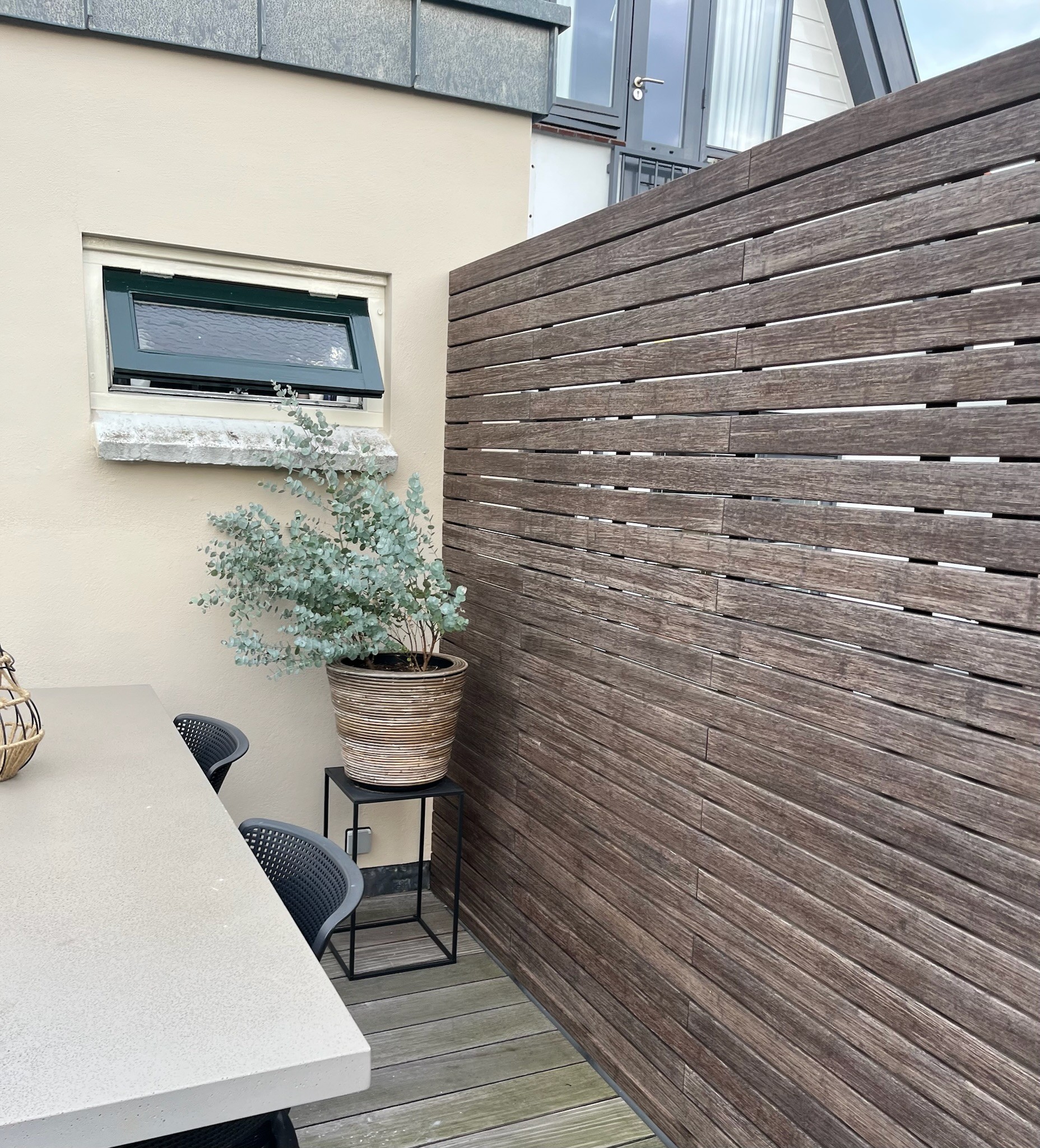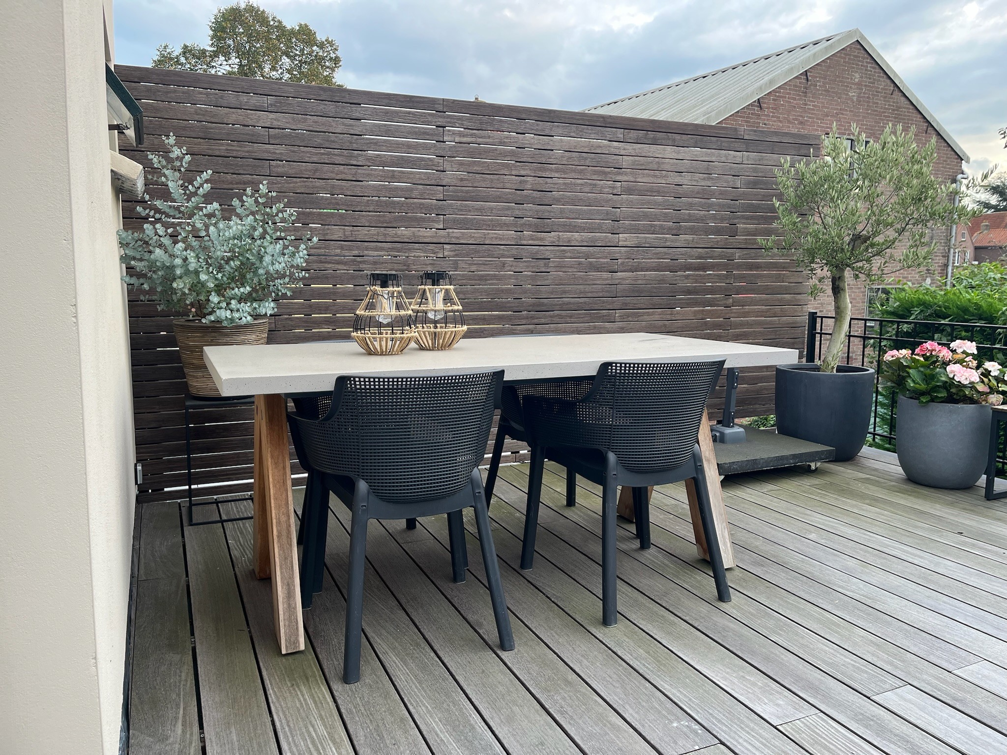 In Oudewater realiseerden wij dit stijlvolle stadstuintje waarin rust, ruimte en functionaliteit samenkomen. Het ontwerp en de aanleg zijn volledig verzorgd door Van Winden Hoveniers. De combinatie van grote keramische tegels, een warme houten vlonder en zorgvuldig geplaatste beplanting zorgt voor een moderne uitstraling met een natuurlijke balans. Door slim gebruik te maken van de beschikbare ruimte is een gezellige zithoek ontstaan waar je het hele jaar door kunt genieten. Een prachtig voorbeeld van hoe een compacte tuin toch groots kan aanvoelen.