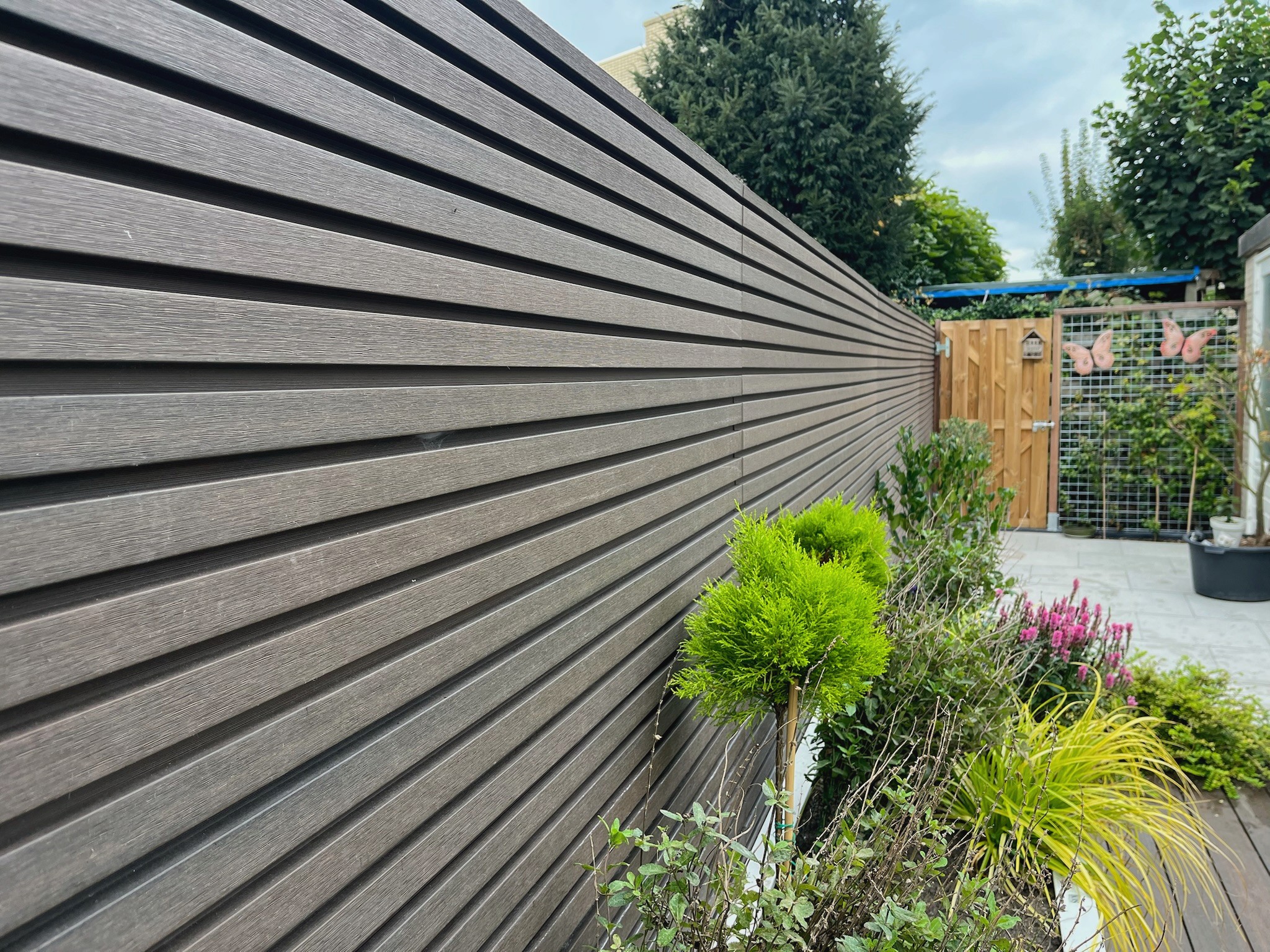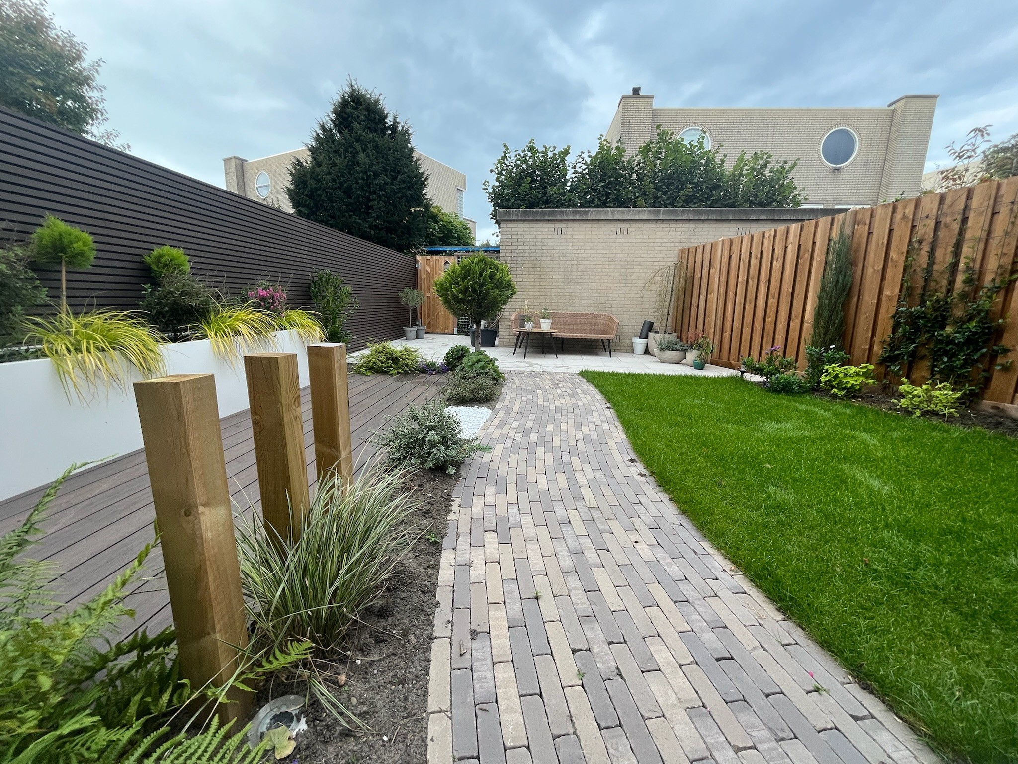 Voor deze tuin in Woerden verzorgden wij het complete ontwerp en de aanleg. De combinatie van een strak terras met lichtgrijze tegels, een warme composietvlonder en een gebogen klinkerpad zorgt voor een moderne, rustige uitstraling. De houten schutting en verhoogde plantenbak brengen warmte en structuur, terwijl het gazon en de beplanting zorgen voor een fris en levendig geheel. Een eigentijdse tuin met een natuurlijke balans tussen steen, hout en groen.